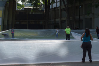 Participatory performance to "Construir el mar (Build the sea)" in the University City of Caracas. Transforming the sea into a human creation is the metaphor for intensifying the modern utopia of a tropical country. This campus was an ambitious project that could build everything but still could not build a sea. This work proposes to build the Caribbean Sea as a reflection on the modern ideals of Venezuela in the 1950s, ideals that contrast with the vicissitudes of the social and political context of Caracas today.